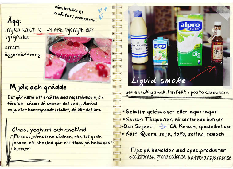 Att inte äta vissa saker kan vara grymt svårt ibland. Särskilt när det kommer till sådant som ägg, mjölk, ost och liknande som ingår i väldigt mycket och som ofta har ett viktigt syfte. Men, det finns faktiskt ersättning för allting nuförtiden. I alla fall för allt viktigt som behövs vid bakning och matlagning, och för att bevisa detta samt underlätta för er som är lite ovana där ute har jag satt ihop en lite guide om vad som kan ersättas med vad och så vidare.