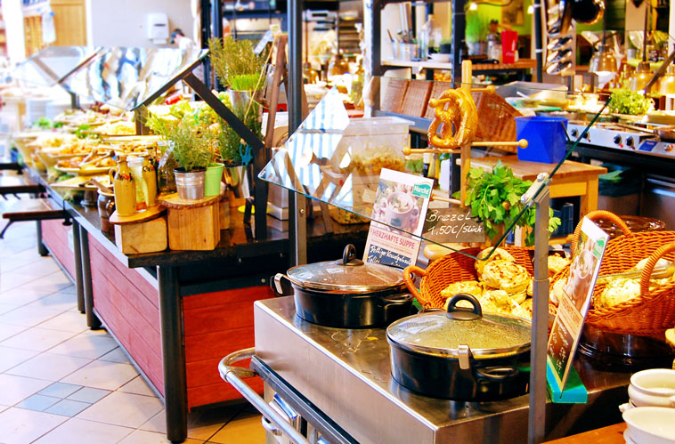 Marché är en restaurangkedja som strävar efter att servera hälsosam och miljövänlig mat. De har restauranger lite överallt, och delvis i Tyskland. De ligger oftast vid motorvägar och man kan lätt tro att det är en vanlig vägkrog med kött och pommes samt lite halvtaskig inredning, men Marchés restauranger är så långt ifrån det som möjligt. De har mängder av mat först och främst och man betalar per tallrik. Det fanns allt ifrån underbart potatismos och soppor till grytor, bakelser och matiga sallader. Vad jag kunde se var nästan allt ekologiskt, och det fanns en särskild disk för ekologisk läsk om man hellre föredrar det.