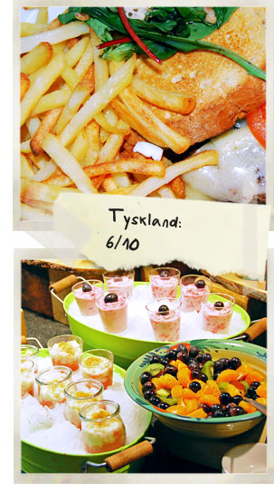 Till slut var det dags för att lämna Tyskland och köra igenom Danmark. Eftersom att det går rätt snabbt att köra igenom det landet gjorde vi bara ett snabbt stopp på en restaurang som låg längs vägen. I Danmark äts det mycket smörrebröd, det vill säga mörkt bröd med pålägg som biffar, grönsaker och röror på. Det fanns inget vegetariskt på menyn alls, dock var det inga problem med att få fram något då kassörskan var väldigt hjälpsam. Så det slutade med en oerhört god baguette med bland annat mozzarella och en tallrik med väldigt goda pommes.